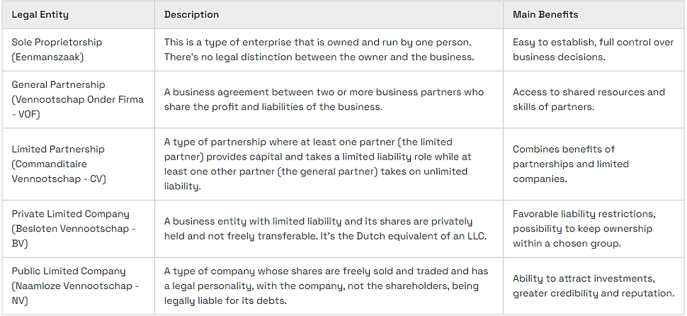Sole Proprietorship (Eenmanszaak): This is the simplest form of business ownership, ideal for freelancers and individual entrepreneurs. As a sole proprietor, you have complete control over your business, but you also assume full personal liability for any debts or legal issues that may arise.